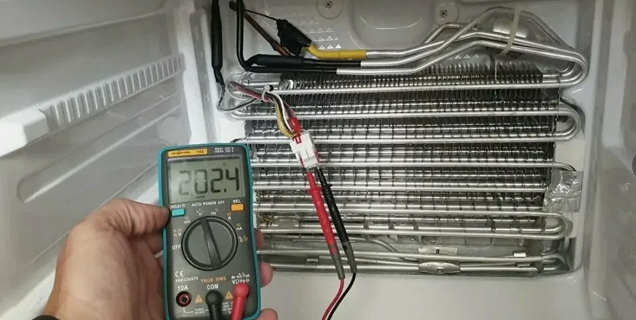 - Проверка системы оттайки. Измеряю сопротивление ТЭНа — пробой, нагреватель в обрыве. Термопредохранитель также подозрителен, но цел. В итоге ситуация: ТЭН оттайки сгорел, испаритель перестал уходить в нормальный цикл разморозки, лёд вырос «шубой» и перекрыл подачу холода вверх, плюс заклинил вентилятор.